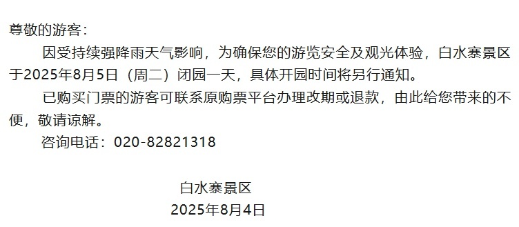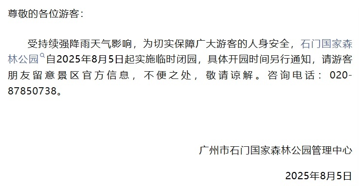因受强降雨影响,4日晚—5日,广东多个景区发布临时闭园通知。