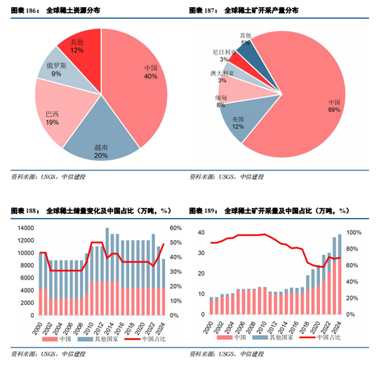 稀土资源集中度高,中国储量、产量均为世界第一,中国是全球稀土产业链最完备的国家。根据美国地质调查局(USGS)的数据,2023年全球稀土探明储量1.1万吨,中国以4400万吨的储量排名第一,占全球40%,其他主要储量国包括越南(2200万吨)、巴西(2100万吨)、俄罗斯(1000万吨)、印度(690万吨)、澳大利亚(570万吨)。在稀土矿产量方面,2024年全球产量约为39万吨REO,其中中国产量27万吨,占比全球约69%。中国不仅拥有丰富的稀土资源,还具备完整的稀土全产业链生产能力,从开采到加工都处于全球领先地位,全球稀土冶炼分离产能和稀土永磁产能超90%集中于中国,中国对全球稀土供给具有举足轻重的影响。然而,近年来,为保障资源安全,其他国家也在加大稀土开发力度。