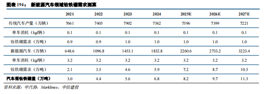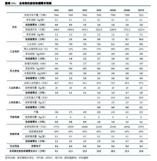 新能源汽车是高性能钕铁硼材料需求拉动最明显的领域,未来需求占比近50%。钕铁硼永磁材料是新能源汽车永磁驱动电机的核心制造材料,预计2026年全球新能源汽车产量将增长至约2800万辆,对应钕铁硼永磁材料需求量将达到8.7万吨,汽车领域对钕铁硼总需求量近10万吨,是高性能钕铁硼材料的第一大需求来源,占高性能磁材需求总量的近50%。新能源汽车领域将成为高性能钕铁硼永磁材料最旺盛的下游需求。