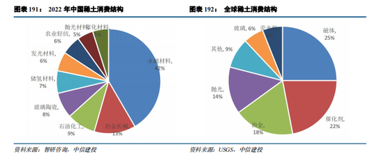稀土下游应用广泛,稀土永磁增长势能充足。稀土功能材料可进一步分为磁性材料、催化材料、发光材料、储氢材料及抛光材料等,其中在我国稀土永磁材料需求占比最大,根据智研咨询,2022年我国稀土永磁材料需求占比达42%。根据USGS,世界稀土消费结构中,磁体、催化剂、冶金占比分别为25%、22%、18%。